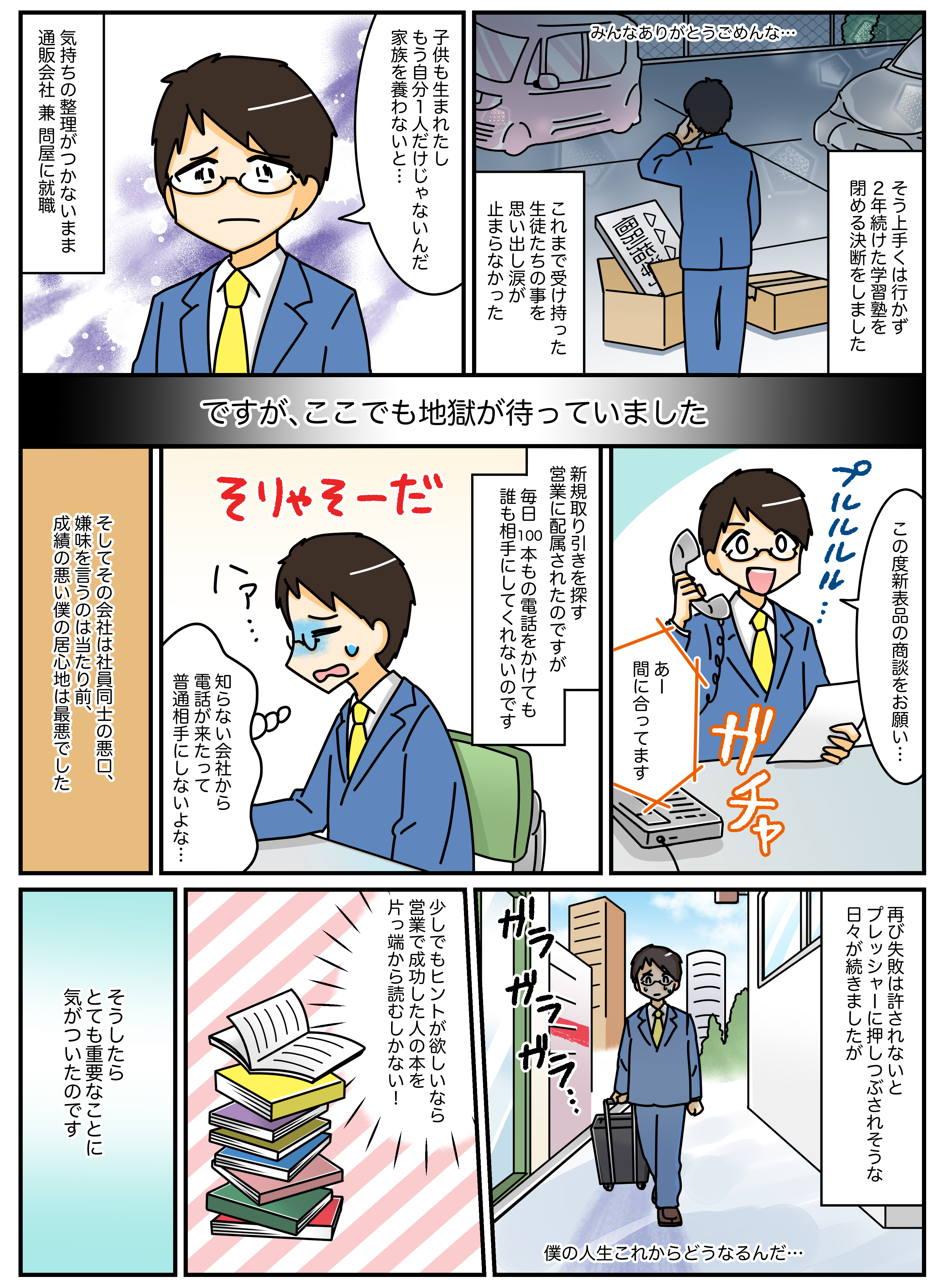今までサラリーマンで頑張ってきた方たちへコンサルタントとして第二の人生の送り方と法人顧客獲得方法をお伝えしております。そんな僕の今までどんな道を歩んで今にいたったのか?を自己紹介がマンガにしました。あなたに一歩踏み出す勇気を持っていただけたら幸いです。