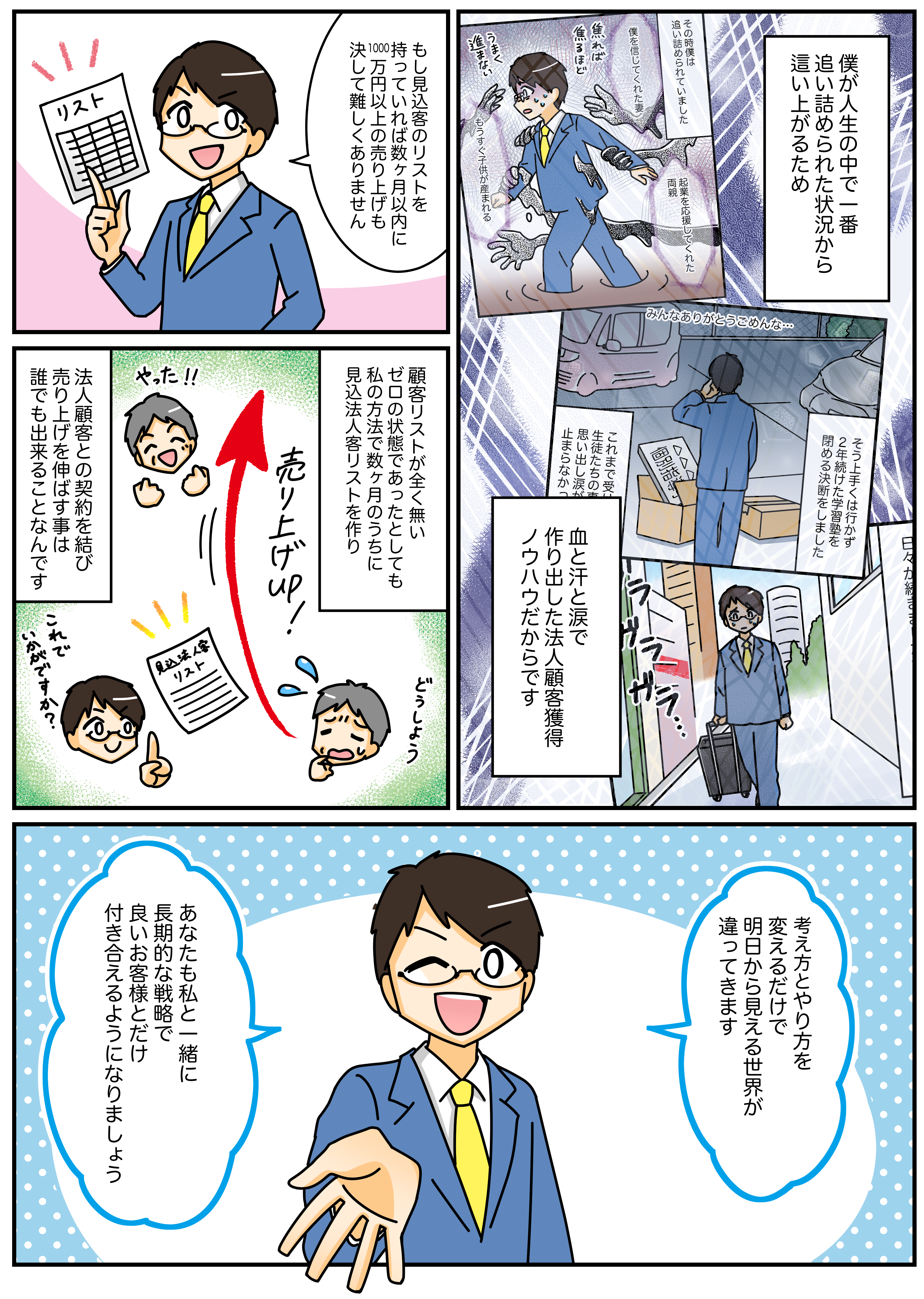 なぜなら、僕自身が追い詰められた経験の中から生みだし培ってきた、血と汗と涙で作り上げた法人獲得ノウハウだからです。